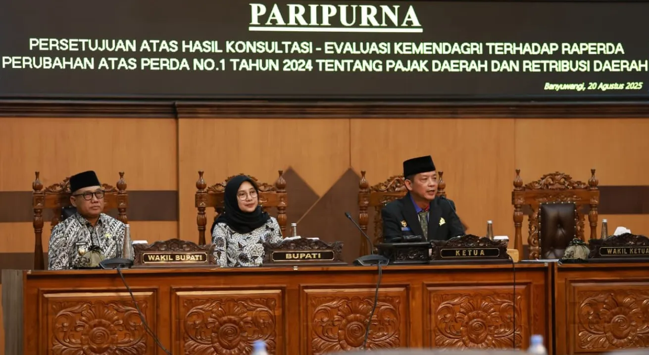 SUARA BANYUWANGI – Pemkab dan DPRD Banyuwangi telah menggelar Rapat Paripurna penegasan penerapan multitarif dalam penentuan tarif Pajak Bumi dan Bangunan Perdesaan dan Perkotaan (PBB-P2) yang berarti sama sekali tidak ada kenaikan tarif PBB-P2 di Ruang Sidang DPRD Banyuwangi, Rabu (20/8/2025) malam.