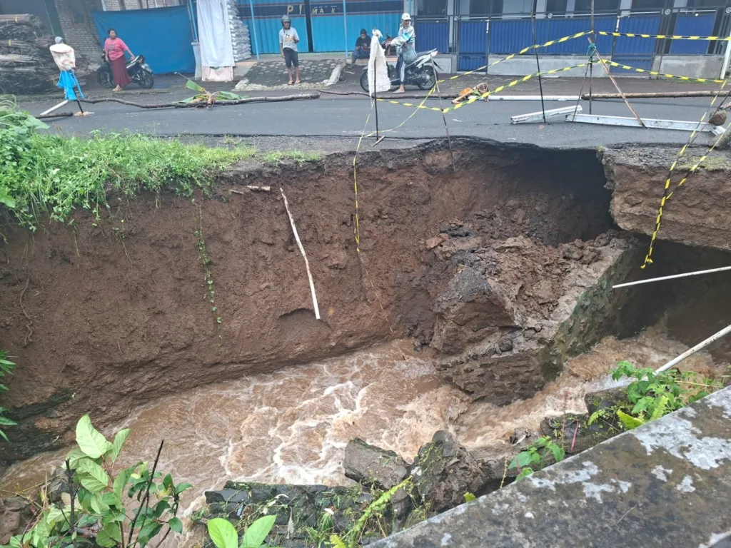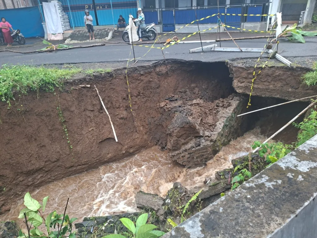 Suara Banyuwangi – Hujan deras yang mengguyur wilayah Kecamatan Songgon Minggu (7/12/2025) sekitar pukul 14.00 WIB mengakibatkan sebuah jembatan poros desa di Dusun Bayurejo, Desa Bayu, RT. 01/RW.01 amblas.